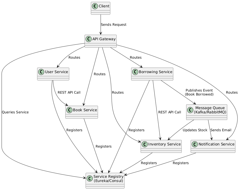 - Ý nghĩa của Microservices: Hệ thống được chia thành các dịch vụ nhỏ, độc lập (Book Service, User Service, Borrowing Service, Notification Service), mỗi dịch vụ chạy riêng biệt và giao tiếp qua API hoặc message queue.